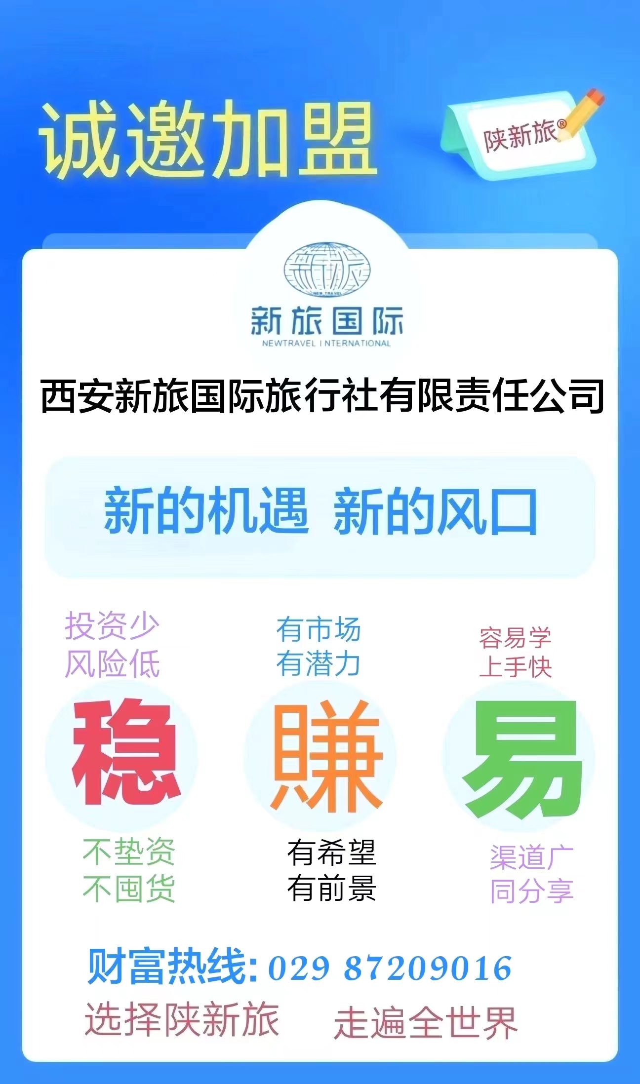 歡迎各地的有識之士能加盟到我們團(tuán)隊中來,資源共享、共謀發(fā)展!為旅行創(chuàng)造精彩,讓游客感動生活;選擇陜新旅,走遍全世界!
