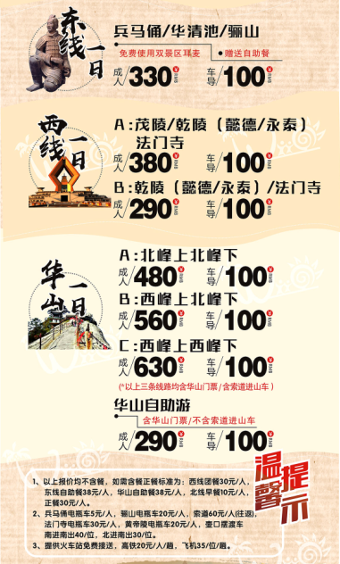 2、景區(qū)電瓶車;兵馬俑 5 元/人華清池 20 元/人驪山索道 60/人往返 (自愿自費)