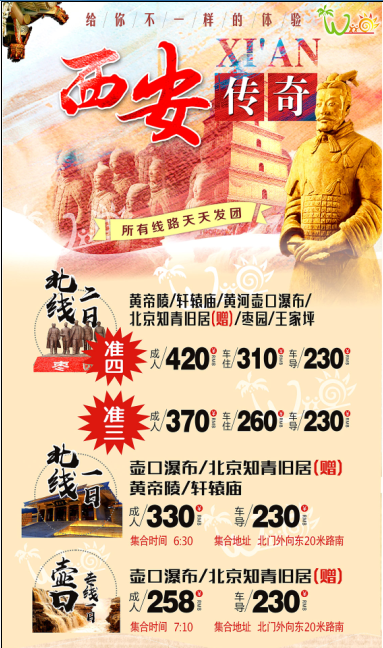 12、請大家增強時間觀念,在規(guī)定的地點按時集中。西安旅游車程相對輕松,西安至延安約5小時,西安至臨潼約1.5小時(在游覽過程中請嚴格按照導游規(guī)定的時間地點結(jié)合上車,誤時不等);