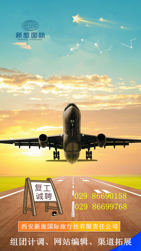 西安新旅國旅總社招聘:渠道拓展專員歡迎各位有志于旅游業(yè)的人士加入西安新旅國際旅行社有限責(zé)任公司,攜手共進,共謀發(fā)展!
